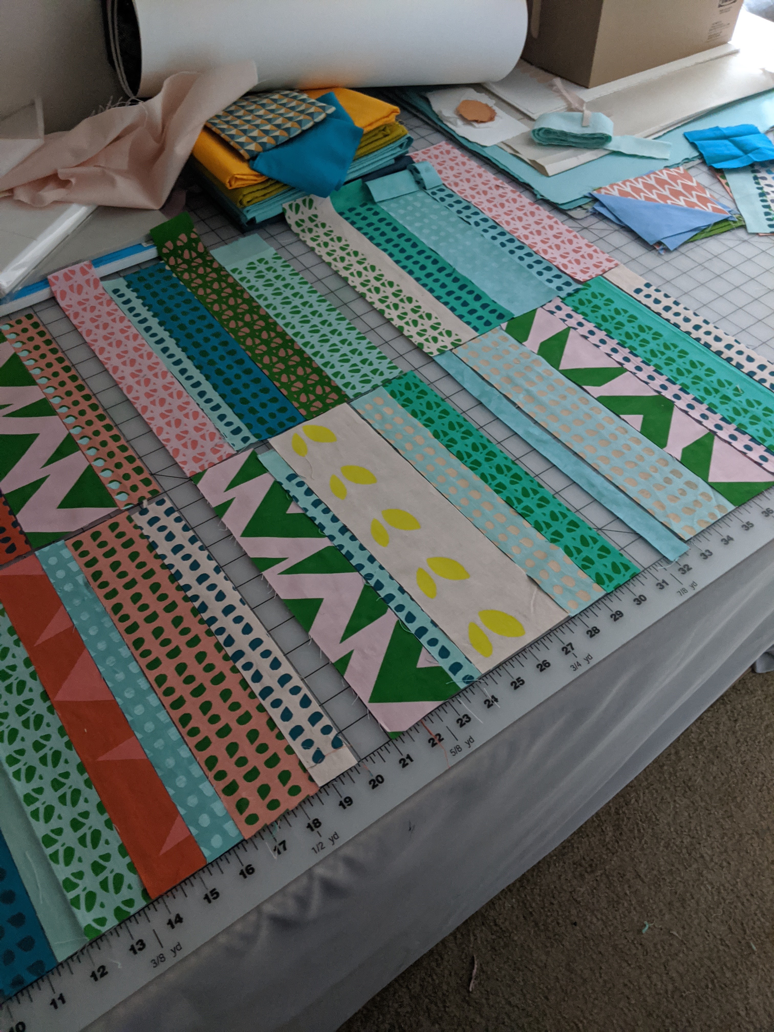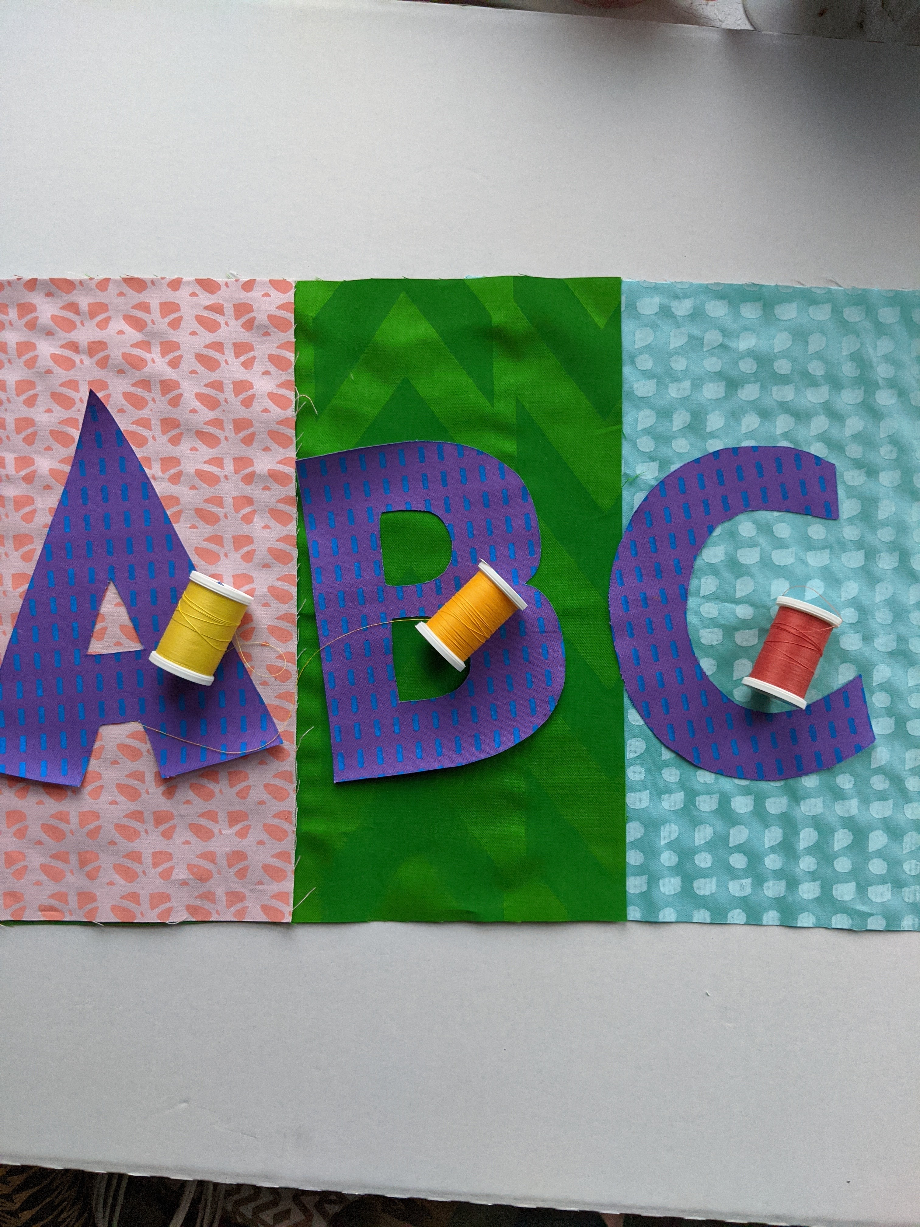 I had a vision for the back of the ABC quilt. I wanted it to be just as fun as the front! I found this great teal fabric from Firecracker Fabrics in Pittsburgh and printed with a darker blue and a deep magenta.